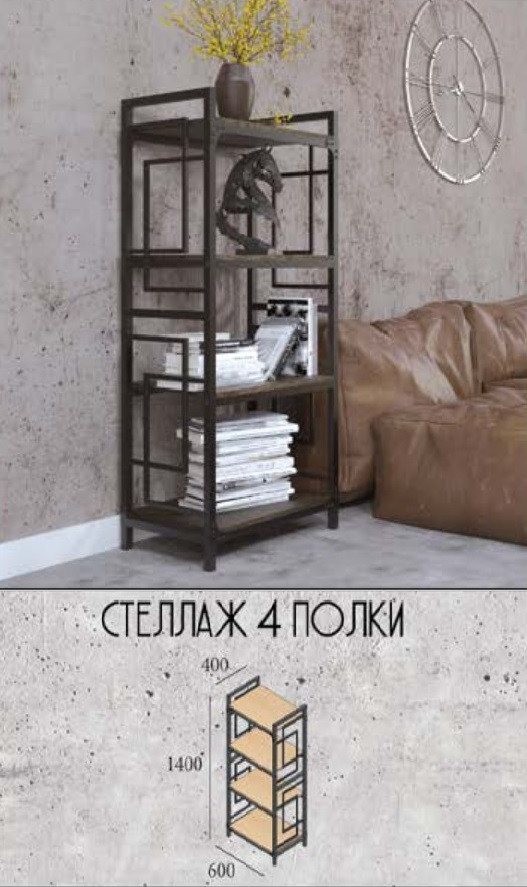 Чотири полки розміром 548х400 мм; Бічні стінки з геометричним візерунком - виконаний в стилі Лофт - міцна конструкція.